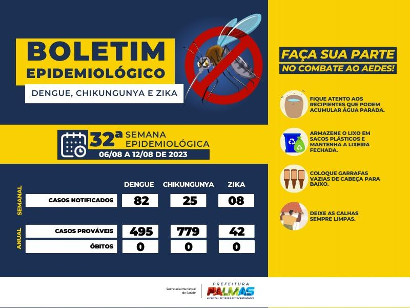 O Boletim Epidemiológico das Arboviroses publicado nesta terça-feira,15, traz informações referente a semana de 06 e 12 de agosto. Durante esse intervalo, foram identificados 82 casos suspeitos de dengue. O documento também menciona 25 casos suspeitos de chikungunya e oito casos suspeitos de zika vírus.