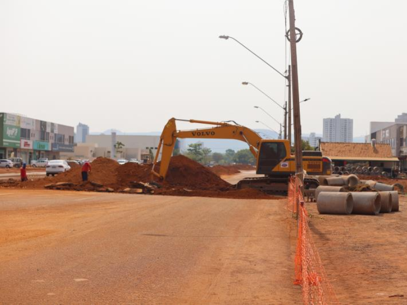 Considerando só a avenida, já foram executados, até o momento, cerca de 600 metros de galeria pluvial, desde os cruzamentos da Av. LO-9 com a NS-1 e com a NS-3. A avenida segue com faixas de circulação reduzidas e sinalizadas em função da movimentação de máquinas pesadas.