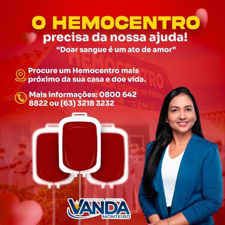 A deputada estadual Vanda Monteiro utilizou suas redes sociais e grupos de WhatsApp para incentivar amigos e seguidores a doarem sangue e ajudarem o Hemocentro de Palmas, que enfrenta estoques reduzidos. A Secretaria de Estado da Saúde do Tocantins (Sesau) destacou que a queda nas reservas é comum após o período de férias e pediu a colaboração de doadores regulares e novos.