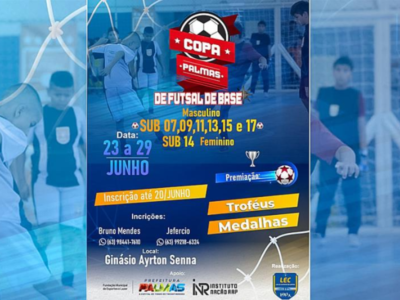 As inscrições para a ‘Copa Palmas de Futsal de Base’ terminam nesta terça-feira, 20. O evento que acontece entre os dias 23 e 29 de junho é uma promoção da Liga de Esportes da Capital, em parceria com a Fundação Municipal de Esportes e Lazer (Fundesportes). Para realizar as inscrições os interessados devem entrar em contato com os organizadores pelos fones: (63) 98441-7610 (Bruno Mendes) e (63) 99218-6324 (Jerfércio Souza).