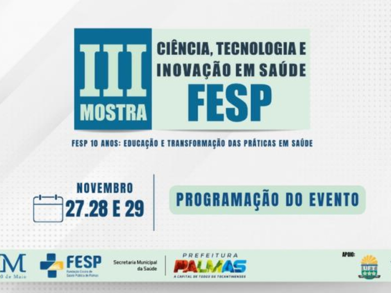 As inscrições para a III Mostra de Ciência, Tecnologia e Inovação em Saúde da Fundação Escola de Saúde Pública de Palmas (Fesp) continuam abertas. Para ouvintes o prazo de inscrição encerra em 24 de novembro e para quem tem finalidade de submeter resumo de trabalhos científicos é até 10 de novembro.