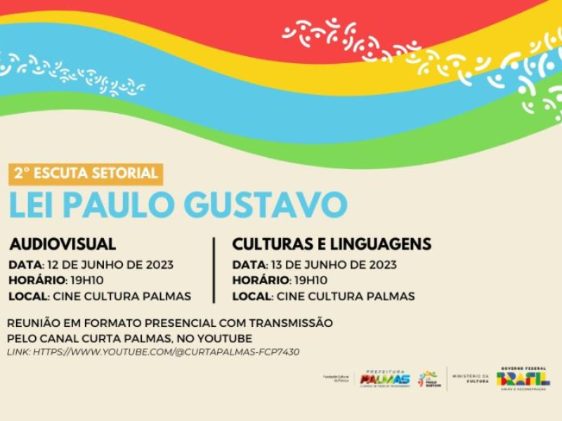 A Fundação Cultural de Palmas (FCP) realizará novas escutas setoriais da Lei Paulo Gustavo, com as reuniões acontendo nos dias 12 e 13 de junho, às19 horas, no Cine Cultura, sendo dia 12 com representantes do setor audiovisual e no dia 13 de culturas e linguagens. As novas escutas setoriais se fazem necessárias em razão da regulamentação da Lei Paulo Gustavo pelo Ministério da Cultura.