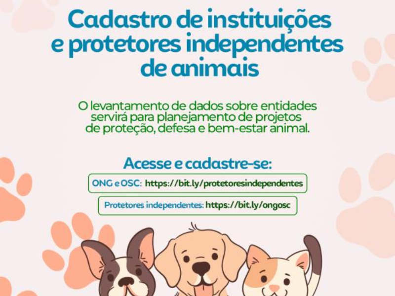 A Secretaria Municipal da Saúde (Semus) e a Fundação Municipal de Meio Ambiente (FMA) realizam cadastro de Organizações Não Governamentais (ONGs), Organizações de Sociedade Civil (OSCs) e protetores independentes de animais domésticos. O objetivo é levantar dados sobre as entidades e os serviços prestados para a elaboração de políticas públicas municipais de proteção e defesa do bem-estar animal. A Gestão Municipal chama todos os envolvidos para participarem do levantamento de informações.
