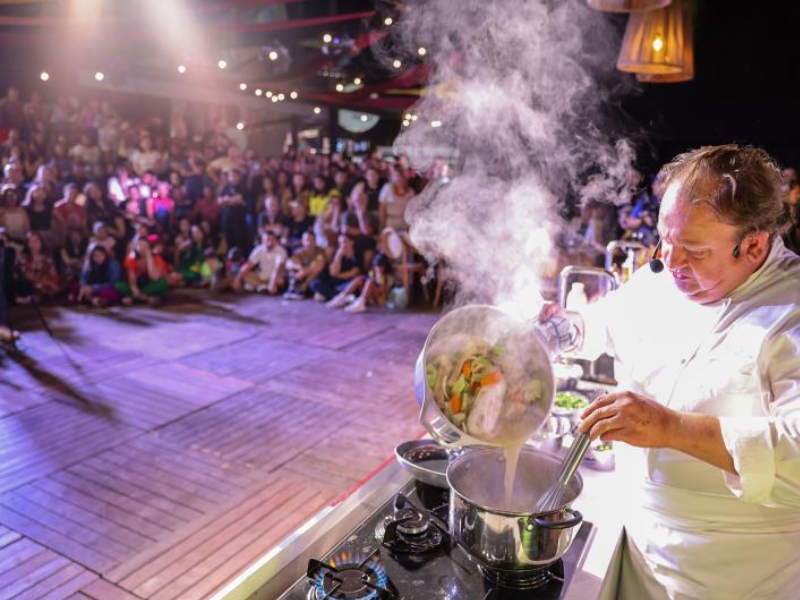 Um dos pontos altos da noite foi a presença do jurado do Masterchef Brasil, o francês Érick Jacquin, que brilhou na Cozinha Show com todo seu talento e carisma. Jacquin que ficou conhecido com seu jargão ‘Tompêro’ preparou uma receita clássica francesa com ingredientes regionais como o baru. O processo meticuloso de preparação do frango processado com cogumelos e baru, cozido no molho de verduras, embalado no plástico insulfilm, foi revelado com maestria, deixando o aroma delicioso se espalhar pelo local.